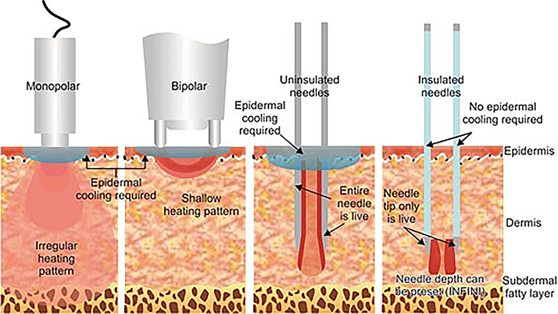 در این نوع، دو قطب در یک هندپیس قرار دارند و امواج فقط در بین این دو جریان پیدا میکنند؛ بنابراین گرما سطحیتر است و برای نواحی حساس مانند صورت، اطراف چشم و گردن ایدهآل است.
