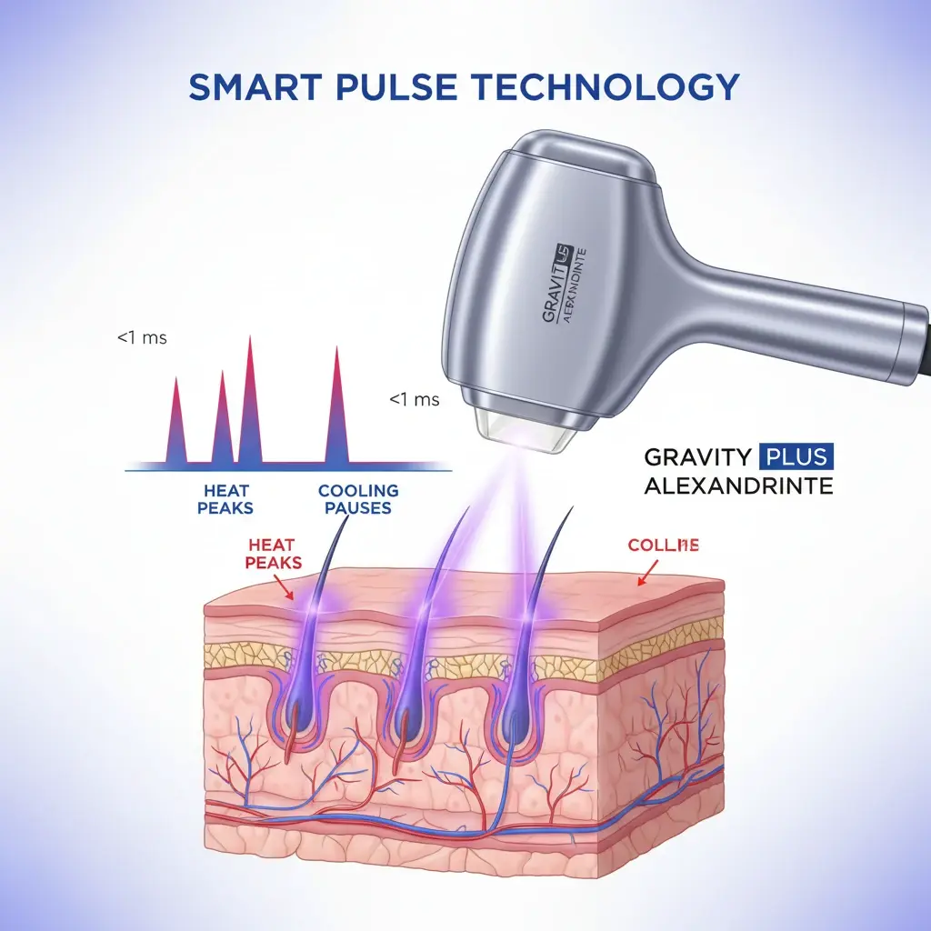 سیستم هوشمند smart pulse دستگاه لیزر الکساندرایت گرویتی پلاس: برخلاف لیزرهای رایج که از یک پالس و یا حداکثر چهار پالس استفاده میکنند این دستگاه با داشتن تکنولوژی منحصر به فرد smart pulse هشت پالس با یک Duty Cycle به صورت smart ایجاد میکند که عرض هر پالس از یک میلی ثانیه کمتر است. در فاصله بین پالسها پوست استراحت میکند و سیستم کولینگ باعث می شود گرمای حاصل با سرعت بیشتری دفع گردد.این لیزر حتی در مد 3 و 5 میلی ثانیه نیز به ترتیب از یک قطار 2 و 4 پالس استفاده میکند. Smart pulse درد را تا حدی پایین میآورد که عملا بدون کولینگ خارجی نیز درد احساس نمیشود و حتی برای پوستهای تیره و نواحی تیره بدن بهترین پاسخ را بدون سوختگی ایجاد میکند.