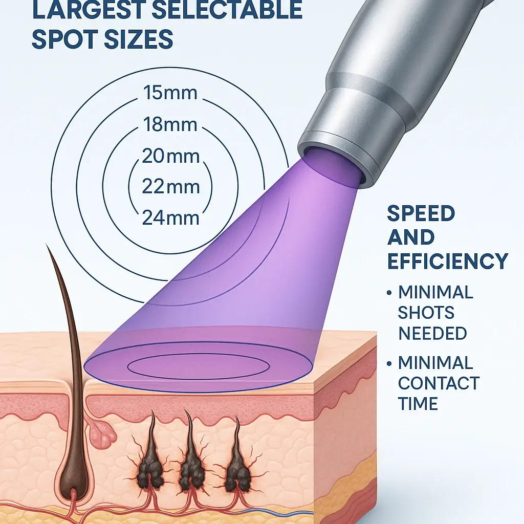 بزرگترین spot size بدون افت انرژی در این لیزر وجود دارد، قطر پرتو 15 ،12 ، 18 ، 20 ، 22 و 24 میلی متر به صورت انتخابی در این دستگاه قابل بهره برداری است. اپراتور تنها با یک بار شات زدن در ناحیه انتخابی با هندپیس بزرگ دستگاه لیزر گرویتی قادر است فولیکول مو را به صورت کامل از ریشه نابود کند، همین امر موجب میشود تعداد شاتها ومدت زمان نگهداری هندپیس روی سطح پوست زیباجو به حداقل رسیده و بیشترین بازدهی را در کوتاهترین مدت به همراه داشته باشد.