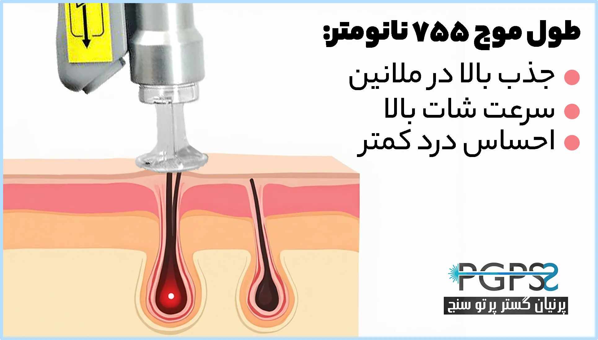 قدرت جذب بسیار بالا در ملانین: طول موج ۷۵۵ نانومتر بیشترین جذب در ملانین رو داره → موهای روشن، نازک و حتی کرکی رو بهتر از دایود و Nd:YAG از بین میبره.